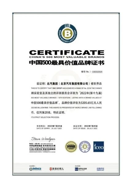 El 26 de julio, el World Brand Lab publicó el informe de análisis "Las 500 marcas más valiosas de China" de 2022. En este informe anual basado en el análisis de datos financieros, la fortaleza de la marca y el comportamiento del consumidor, Grupo de BAIC ocupó el 20º puesto en la lista con un valor de marca de 320.565 millones de yuanes, que aumentó en unos 14.300 millones de yuanes ocupando el tercer lugar en la industria de automotriz de China.. Al mismo tiempo, Foton de BAIC ocupó el 34º puesto en la lista con un valor de marca de 191.516 millones de yuanes y el cuarto en la industria de automotriz.