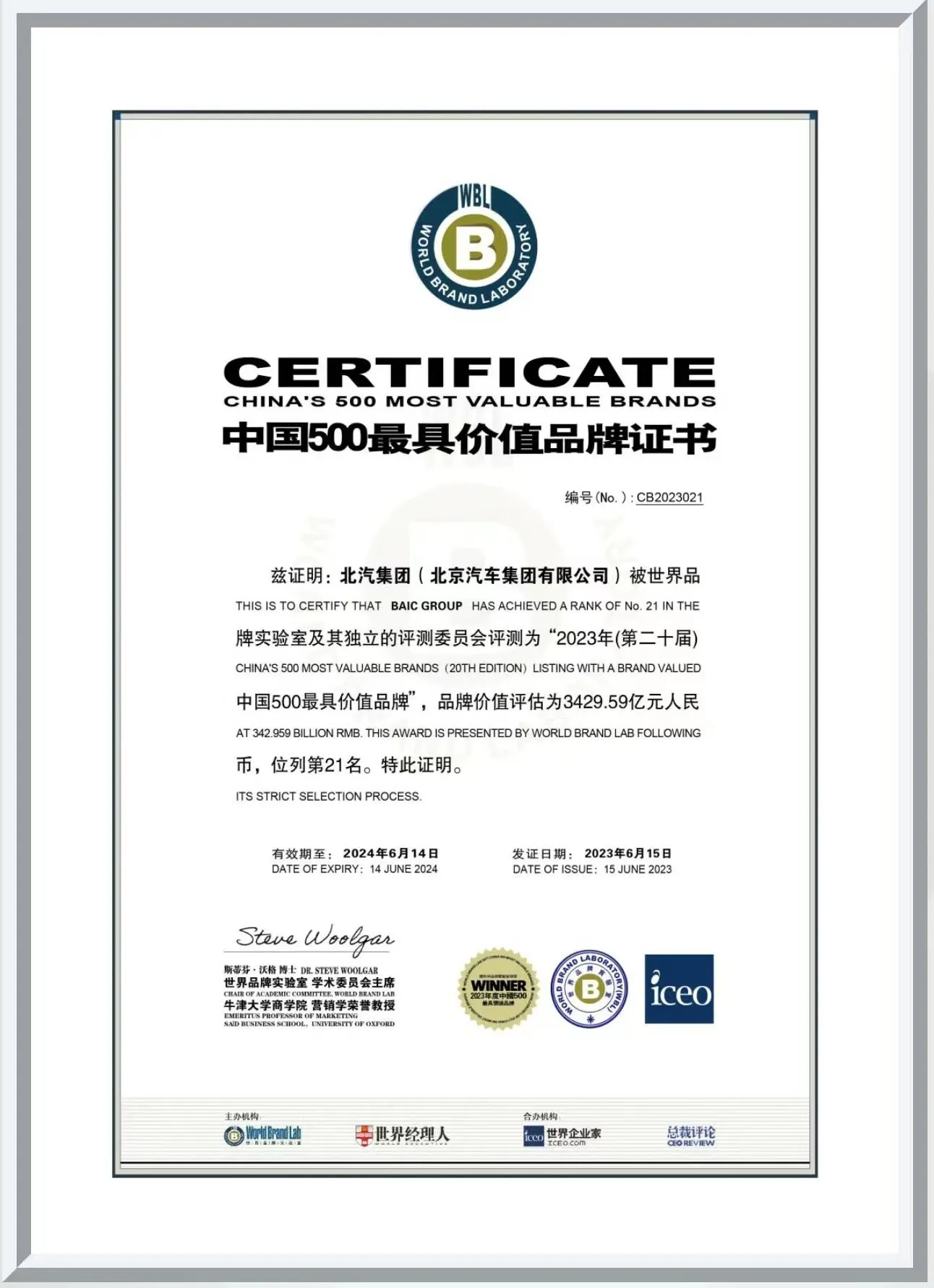 Recientemente, se publicó oficialmente el informe de análisis de Las 500 marcas más valiosas de China de 2023, publicado por World Brand Lab, en el que el Grupo BAIC ocupó el puesto 21 con un valor de marca de 342.959 millones de CNY, manteniendo la tercera posición en la industria automovilística de China y un aumento significativo de unos 22.400 millones de CNY en valor de marca en comparación con el año pasado.