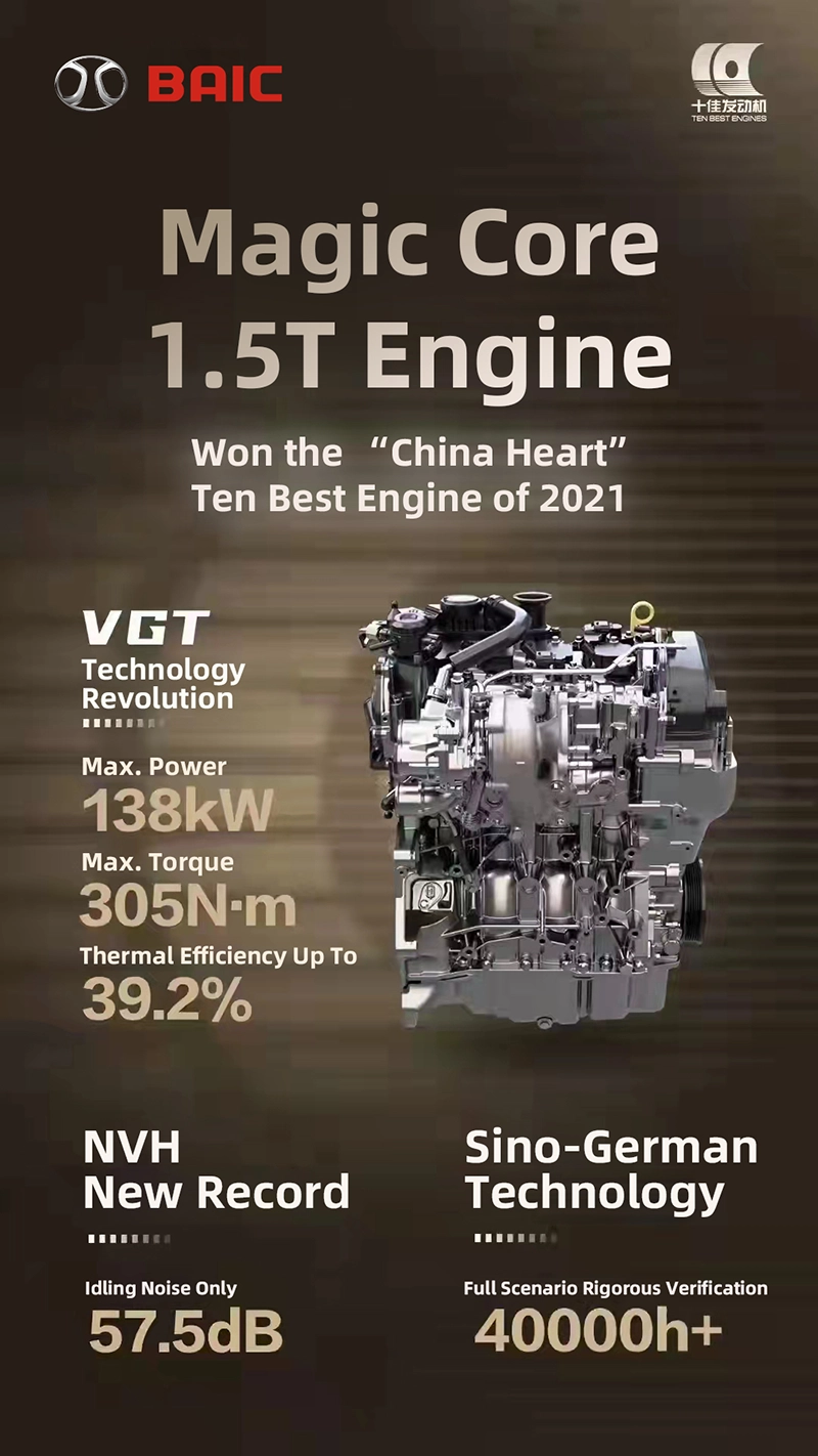 El 8 de noviembre, se publicaron oficialmente los resultados de la selección del motor de Top Ten de "Corazón de China" 2021. Finalmente, ganó el Premio de Motor de Top Ten de " Corazón de China " de 16ª Sesión el motor de Nucléo Mágico de 1.5T de BAIC.